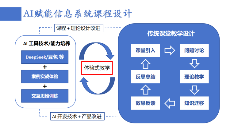 顺应2025年以来国家教育数字化战略对人工智能深度融入教学的要求,课程组将生成式AI工具系统引入《信息系统分析与设计》课程。课堂在系统规划、需求分析、系统设计等环节引入AI,通过项目实战串联辅助学生高效掌握结构化生命周期法与面向对象开发的核心逻辑。通过掌握学习引导学生探索AI驱动的创新性系统建模,提升解决复杂工程问题的能力,建立系统思维。课后,AI对学习效果进行汇总、反馈、分析和总结,帮助教师实现课堂进度把控与学生学情的动态追踪与精准干预,形成“教-学-评-辅”一体化闭环。